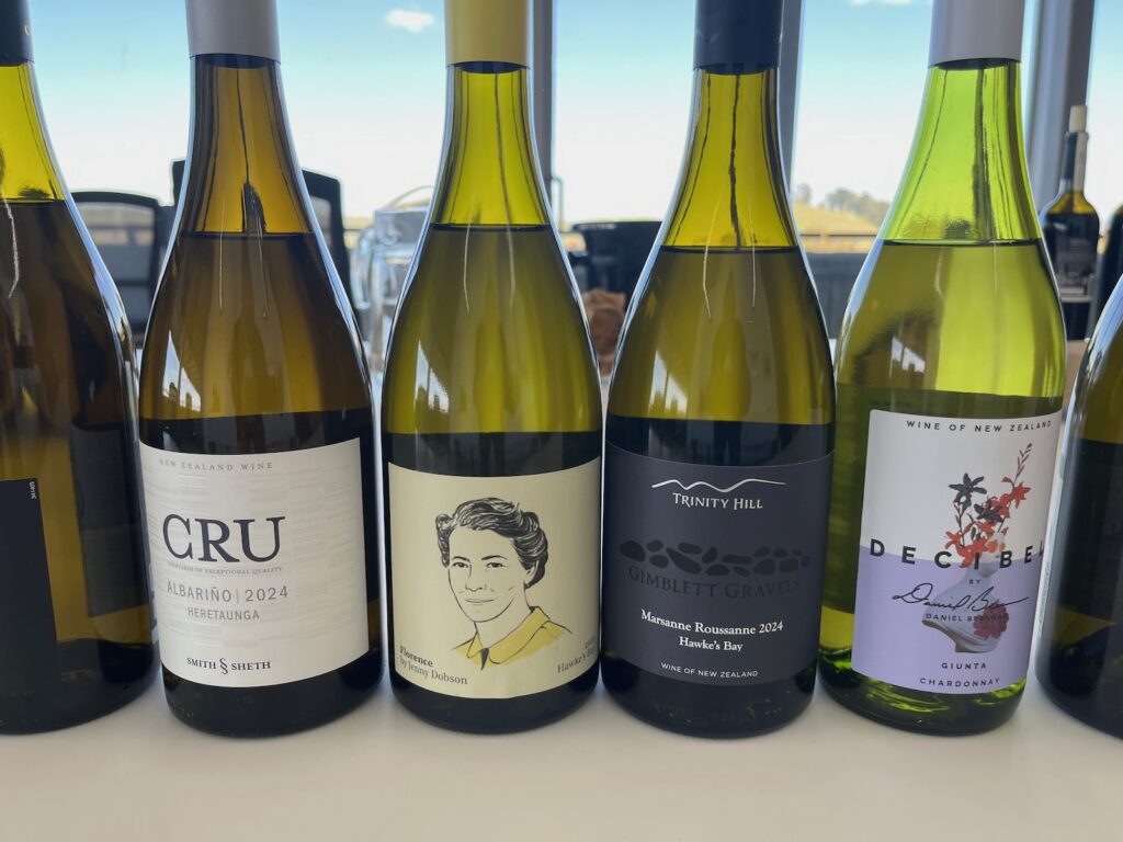 Jenny Dobson ‘Florence’ Fiano 2023 showcases exactly the sort of ‘emerging varietal’ that isn’t something you come across every day… and was what I’d hoped to see. It isn’t a million miles away from the Albariño previously, with a touch more golden body and weight. Apple, citrus and lemon blossom florals on the nose. Zesty acidity gives a brightness through the palate, and finishes with a pithy, dry edge. 92pts. A wine I have seen before is Trinity Hill Marsanne/Roussanne Gimblett Gravels 2024. A pale green-gold in the glass. A youthful perfume shows pear, nectarine, grapefruit, almond, nutmeg and jasmine floral notes. Bags of energy on the palate, where the juicy fruit is complemented by a tangy acidity. It also has an ‘al dente’ texture, with dry phenolics that contrast well with the voluptuous flavours. 93pts