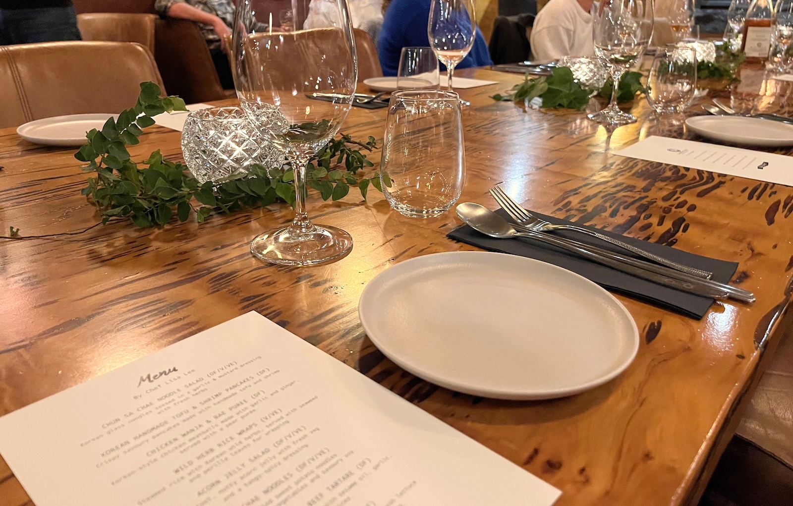 Then Lance stood up and told us about fairy dust on the vines (yes, really). Enter Crystal Veil 2023, a Sauvignon Blanc aged in Totara wood – basically the most Aotearoa wine ever. Textured, green, savoury, soulful. It paired perfectly with the wild herb rice wraps and spicy, umami-rich acorn jelly salad.