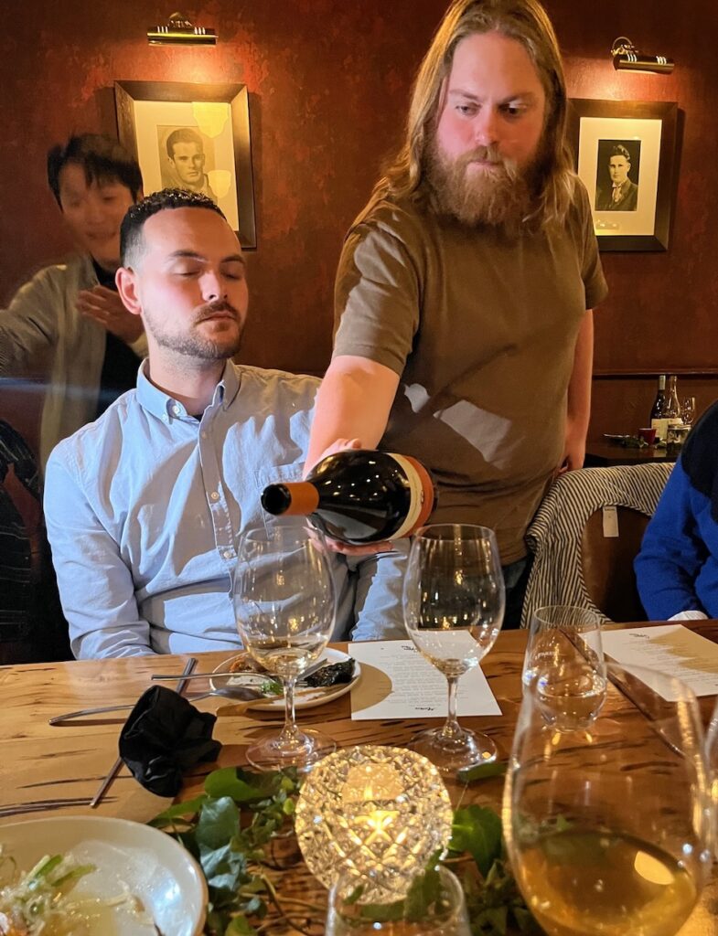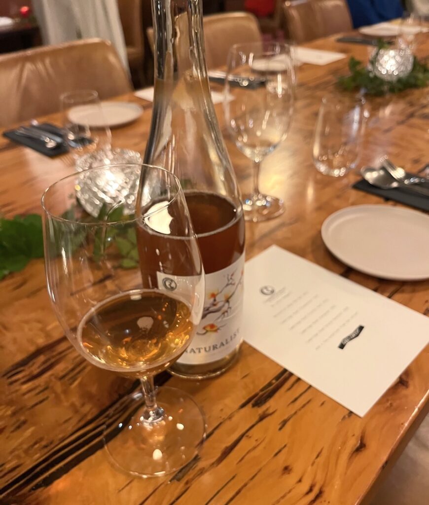 The setup? A long table, every seat taken, fireplace lit, food and wine served family-style. No pretentious ‘degustation menu’ vibes – just people passing plates, pouring wine, and bonding over the magic happening on the table. Cue glass noodles with a herby mustard dressing, slippery, chewy and addictive. Add a glass of Naturalist rosé Pet Nat 2023 – pale coral, fizzing with tiny bubbles and flavours of raspberry and rosehip — and you’ve got a very good night underway.