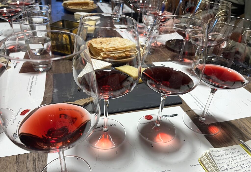 We start with the Bourgogne 2022 which is a light ruby colour and has a precise, clean bouquet. Soft tannins and good acid with a juicy edge serve up a lovely entry level Pinot Noir. Bourgogne Hautes Côtes de Nuits 2022 from the ‘back hills’ turns out to be a big hit around the table. Starting off with a shy perfume, it builds into a crunchy palate with raspy tannin and bright red fruit flavours.