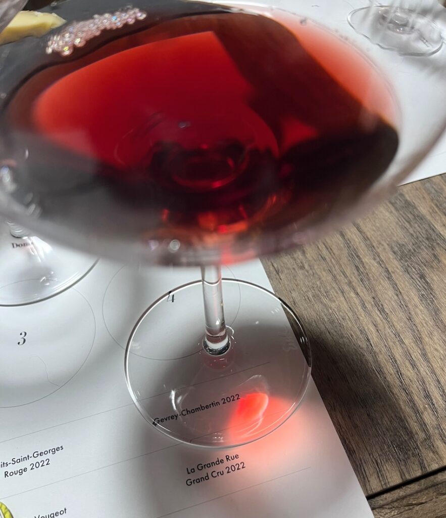 Gevry Chambertin 2022 is softer, with a creamy, lactic texture. Savoury notes of salami, mushroom, spice and truffle come through here, amongst a pop of cherry and redcurrant. There is some amphora ferment happening in this one, which might reflect the lightness and minerality of what’s in the glass.
