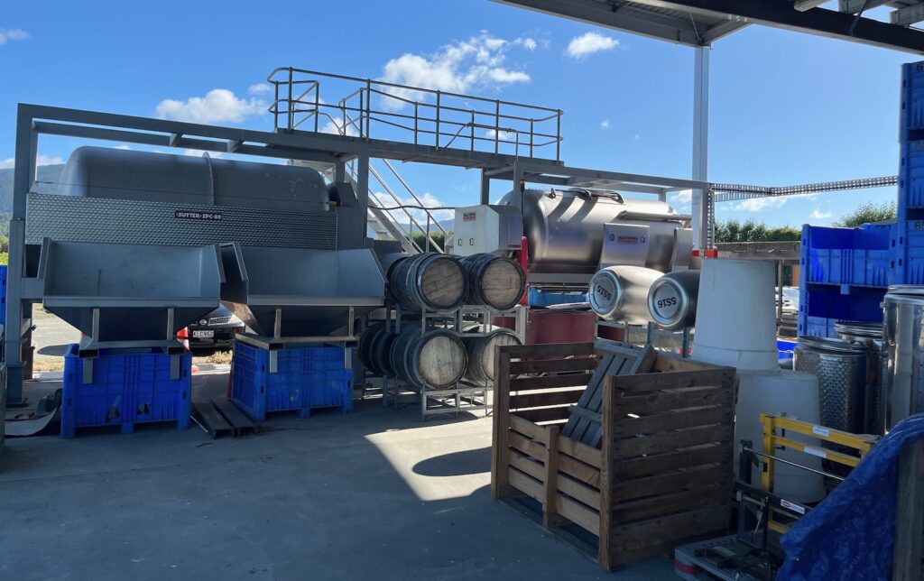 In our reds fermentation room there are ten french wooden oak cuves which are open top. There’s a mobile platform that we can use for doing pigeage. And through here is our crush pad – so you can see the flow through the winery from here. This is where everything starts. Everything is picked into bins, so we don’t have a receival bin. We tip into each press, and the juice goes into tanks or barriques. The payoff of not having the bin is a lot of lifting and forklifting.